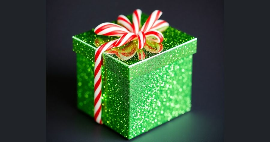 A sparkly green box with candy cane stripes.